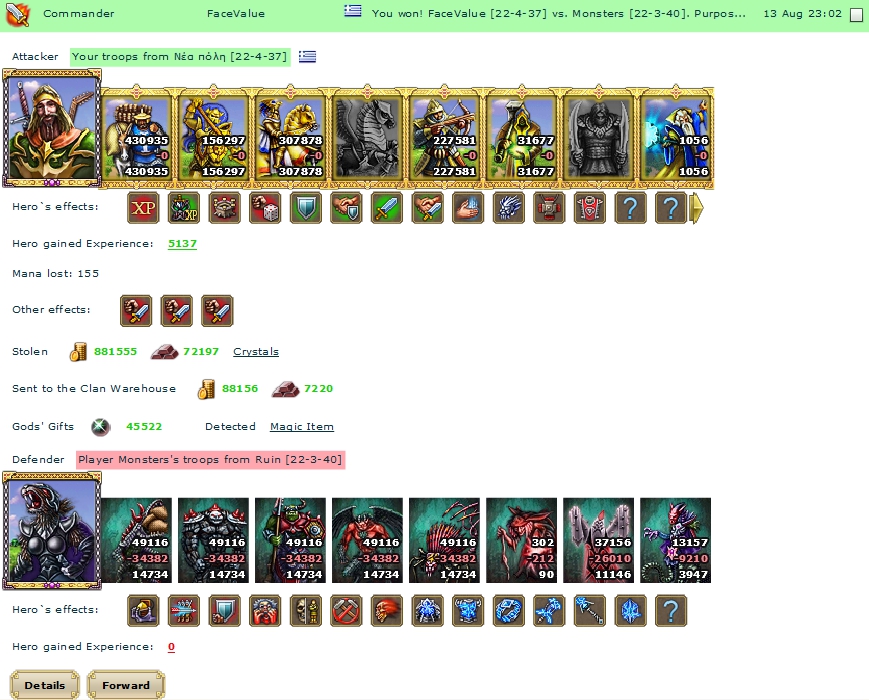 We congratulate the player FaceValue upon annihilation of an Arch-Ruin on 13/08/2017 and winning 45522 Black Gems.