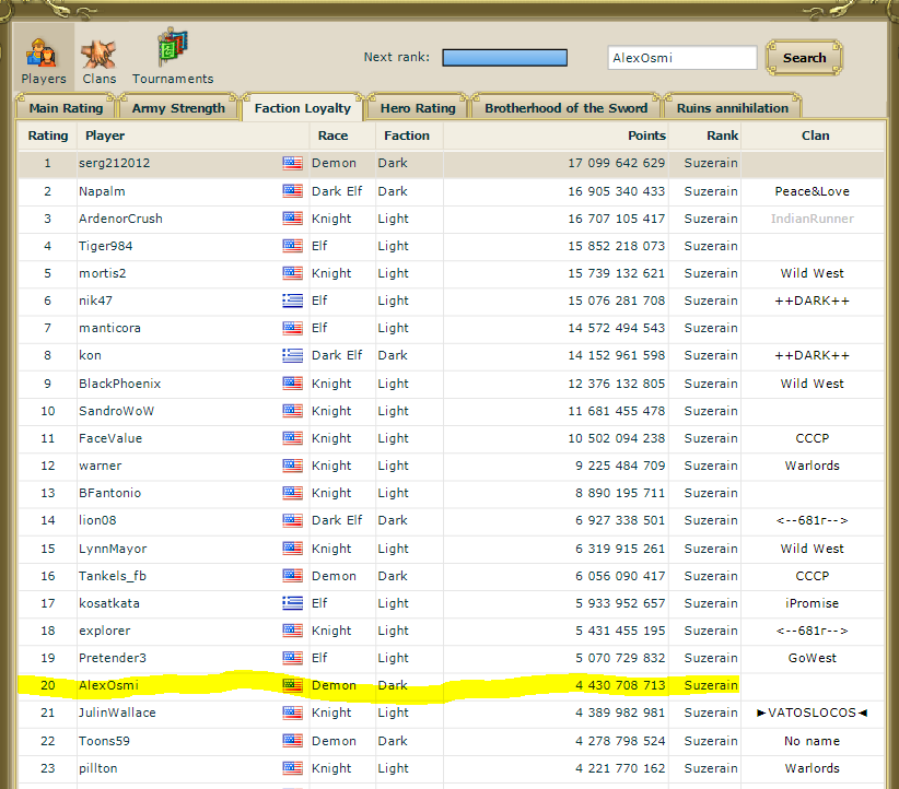 alexosmi have 11M of hero experience and he start yesterday to play again, i have 11M from begining of server. now he is out of clan, probably exchanging faction and experience again with someone.
